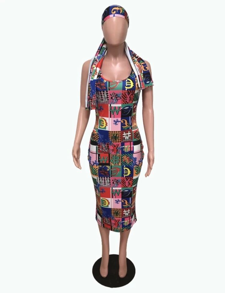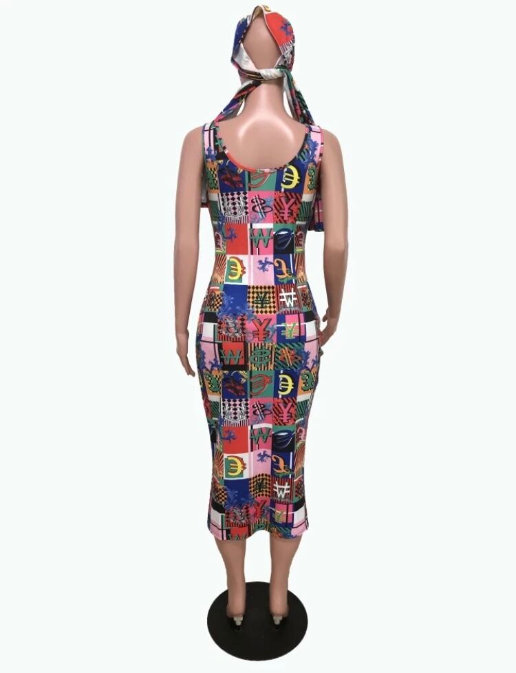 プリントノースリーブ膝丈ワンピース ベッドスカーフ付き